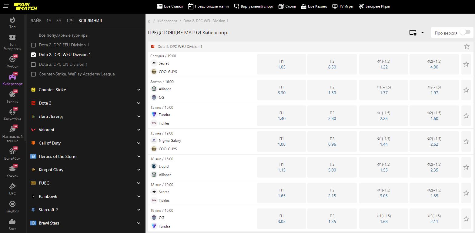 Итак, восемь команд участниц первой серии рейтинговых лиг по Dota 2. DPC WEU Division 1 для Западной Европы уже определены, а сами поединки стартовали согласно жеребьевке. Соревнования будут продолжаться до 19 января 2022 года включительно, а наблюдать за ними болельщикам можно с помощью официального сайта БК «Париматч». Расписание ближайших встреч выглядит следующим образом: