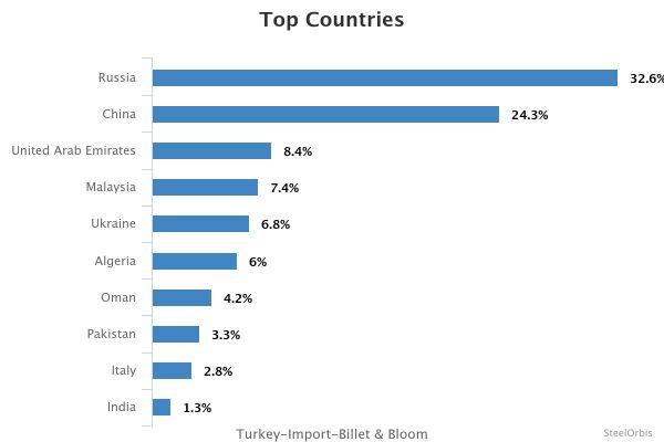 За указанный период крупнейшим источником импорта заготовок и блюмов в Турцию была Россия, которая поставила 236 013 тонн, что на 102,8 процента больше. год в год. За Россией следовали Китай с 175 680 тонн, что на 71,6 процента, и ОАЭ с 60 594 тоннами.